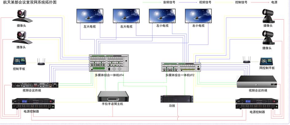 航天某部会议室采用2台K1体育科技UT综合一体机作为两个视频会议网络的多媒体控制核心,分别管理两个网络的音频、视频设备,从而实现双网双控。两网系统共用一套麦克风、音箱及大屏幕,但音视频信号及控制相互独立。